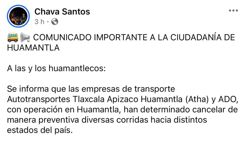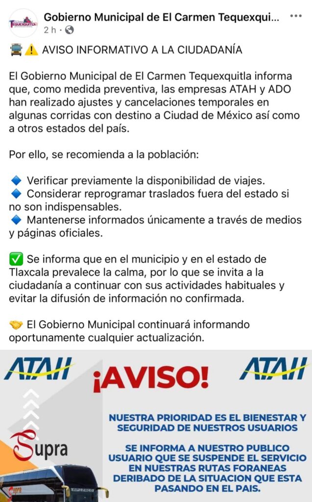 Además, el mismo municipio informó que, como medida preventiva, las empresas ATAH y ADO realizaron ajustes y cancelaciones temporales en algunas corridas con destino a Ciudad de México y otros estados, por lo que recomendó verificar previamente la disponibilidad de viajes, considerar reprogramar traslados fuera del estado si no son indispensables y mantenerse informados únicamente por medios oficiales.