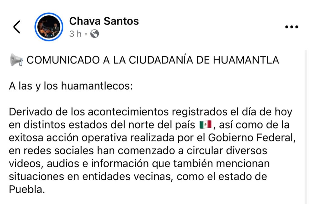 En Huamantla, Chava Santos emitió un comunicado dirigido a las y los huamantlecos, donde explicó que mucha de la información difundida en redes sociales no ha sido confirmada por fuentes oficiales. Hizo un llamado responsable a no compartir rumores ni contenido que pueda generar alarma innecesaria, y destacó que el municipio mantiene coordinación permanente con autoridades estatales y federales para dar seguimiento puntual a cualquier situación que pudiera impactar al municipio.