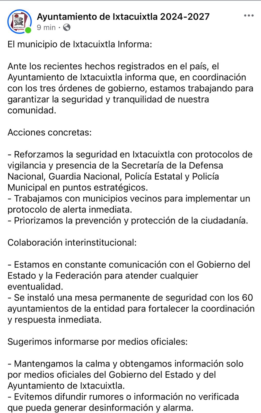 En el caso de Ixtacuixtla, el Ayuntamiento informó que, ante los hechos recientes registrados en el país, se mantiene trabajando en coordinación con los tres órdenes de gobierno para garantizar la seguridad y tranquilidad del municipio. Señaló que se reforzó la vigilancia con protocolos y presencia de fuerzas federales y estatales, además de la Policía Municipal, en puntos estratégicos. También indicó que se trabaja con municipios vecinos para implementar un protocolo de alerta inmediata, priorizando la prevención y la protección de la ciudadanía. En su posicionamiento, Ixtacuixtla destacó que se mantiene en constante comunicación con el Gobierno del Estado y la Federación, y que ya se instaló una mesa permanente de seguridad con los 60 ayuntamientos para fortalecer la coordinación y la respuesta inmediata.