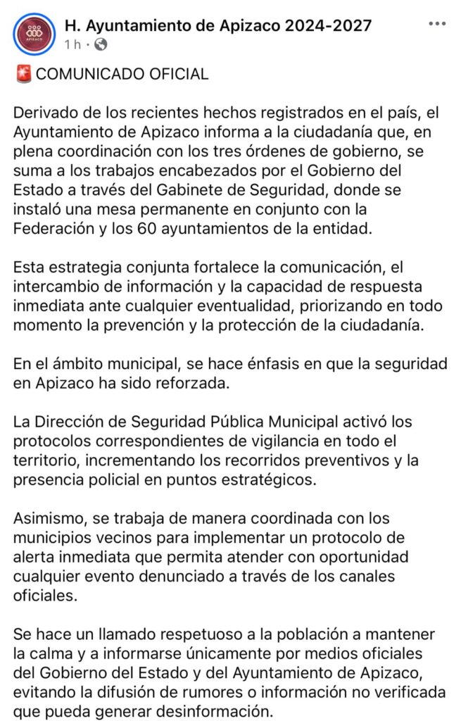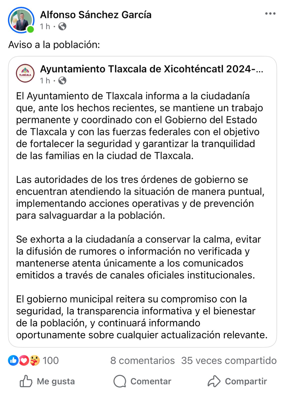 Por su parte, el Gobierno Municipal de Apizaco dio a conocer que se suma a los trabajos encabezados por el Gabinete de Seguridad estatal, donde se instaló una mesa permanente en conjunto con la Federación y los 60 ayuntamientos. Informó que la Dirección de Seguridad Pública Municipal activó protocolos de vigilancia en todo el territorio, incrementando recorridos preventivos y presencia policial en puntos estratégicos, además de reforzar la comunicación con municipios vecinos para implementar un protocolo de alerta inmediata.