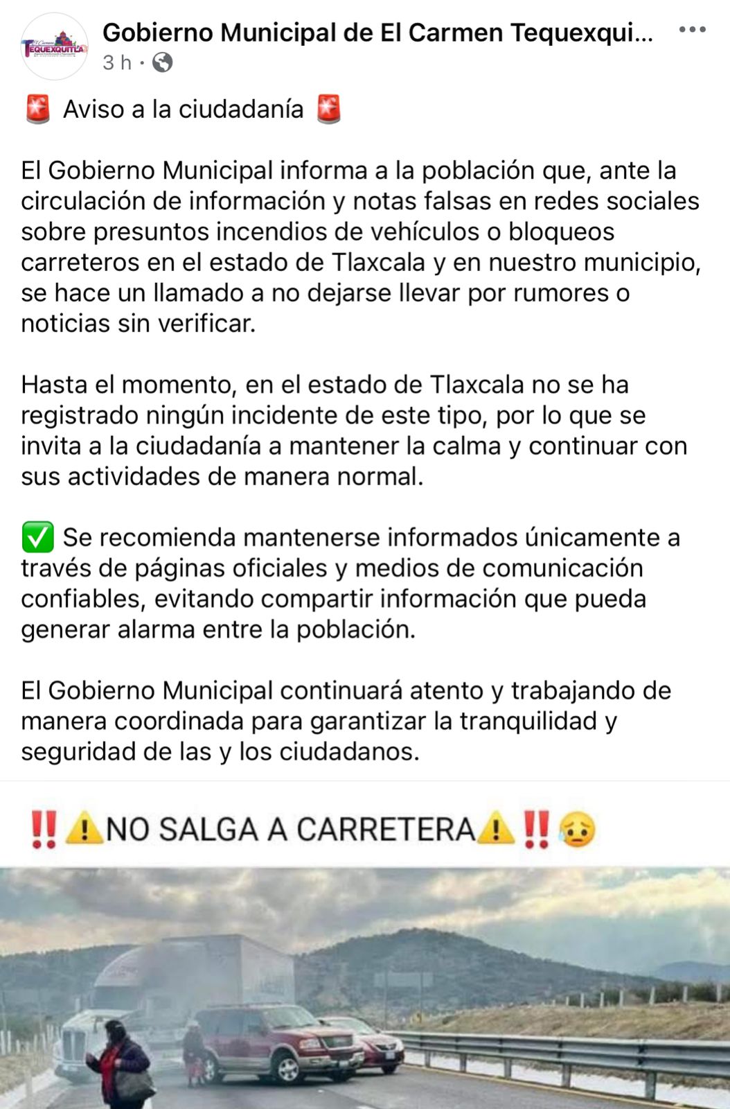 En tanto, el Gobierno Municipal de El Carmen Tequexquitla se pronunció para advertir sobre la circulación de información falsa en redes sociales respecto a presuntos bloqueos o incendios en carreteras, por lo que llamó a la población a no dejarse llevar por rumores o notas sin verificar. Indicó que, hasta ese momento, en el estado de Tlaxcala no se había registrado ningún incidente de ese tipo y pidió mantener la calma y continuar con las actividades de manera normal.
