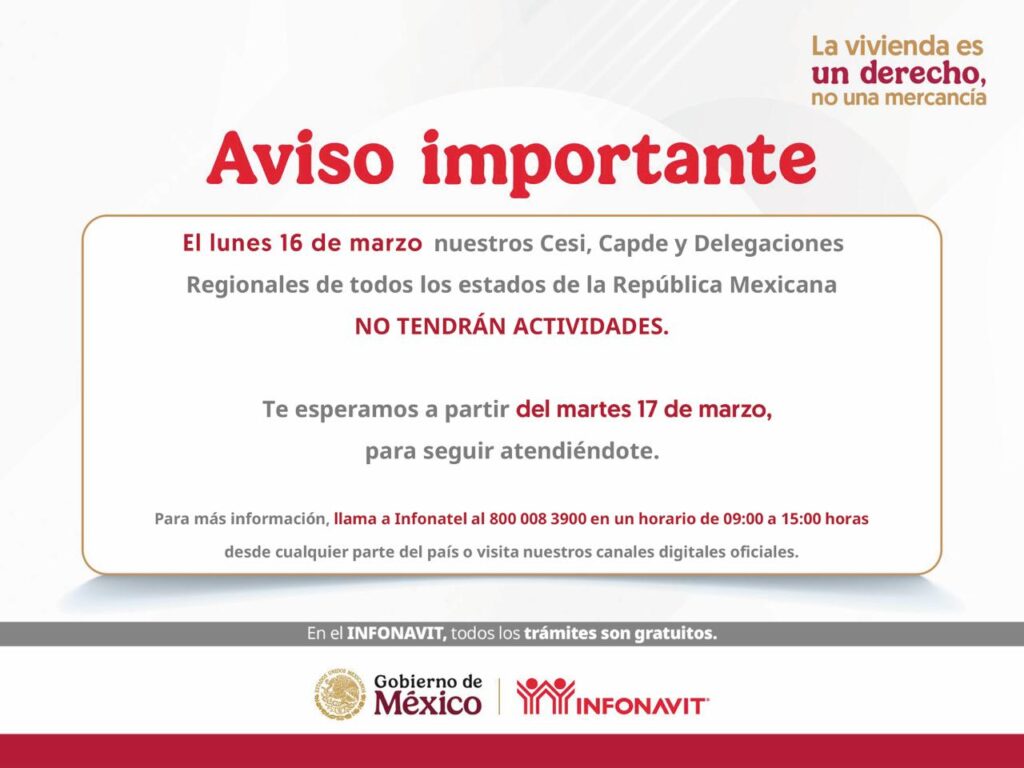 De acuerdo con el aviso difundido, ese día no habrá servicio en los Centros de Servicio Infonavit (CESI), CAPDE y delegaciones regionales en todas las entidades de la República Mexicana, por lo que los derechohabientes deberán considerar el cierre para la realización de trámites o consultas presenciales.
