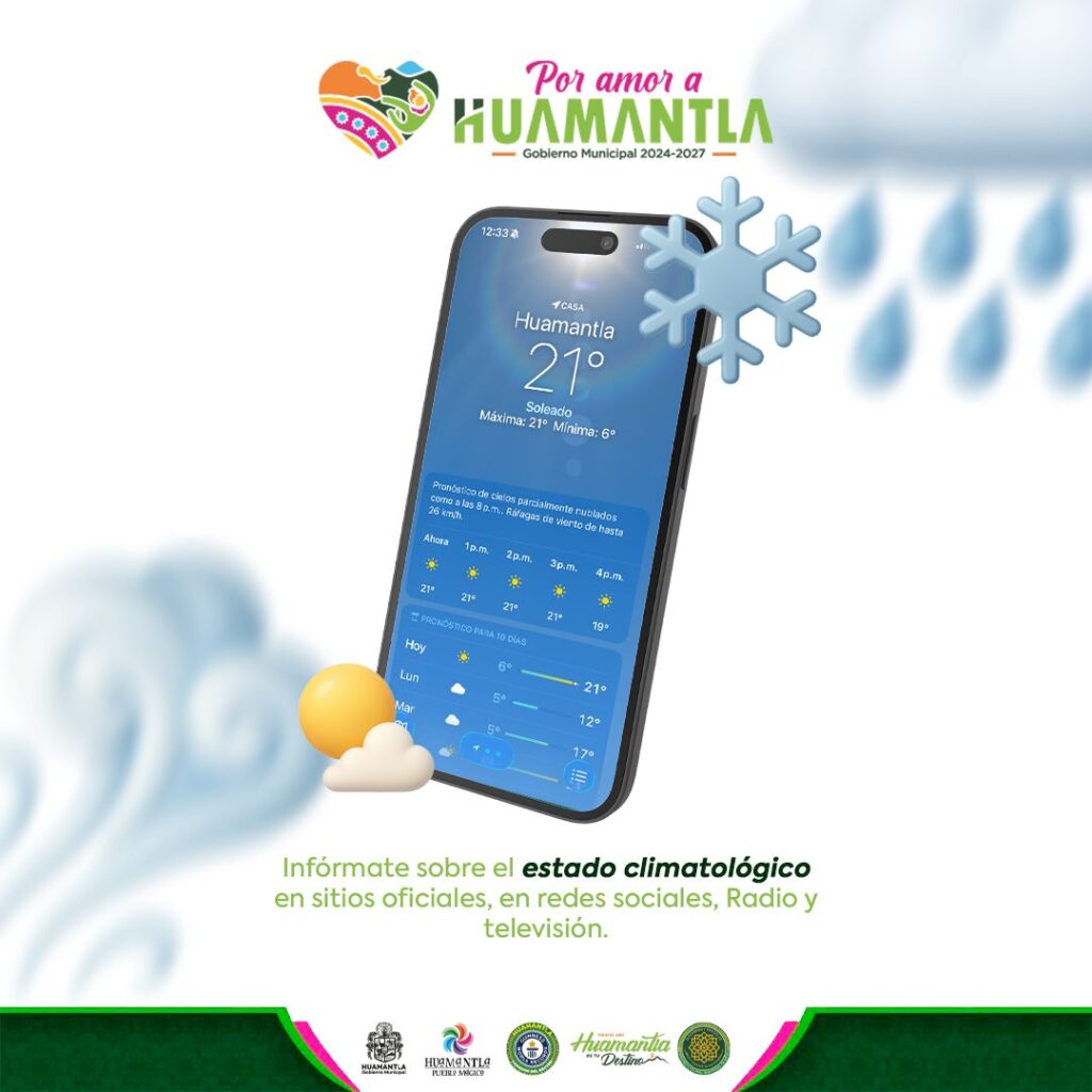 El H. Ayuntamiento de Huamantla exhorta a la ciudadanía a mantenerse atenta a los reportes meteorológicos y avisos oficiales que se emiten en las plataformas institucionales, ante el descenso de temperatura propio de la temporada invernal.
