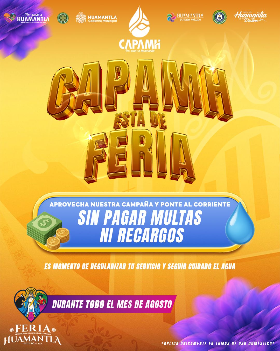 En el marco de las celebraciones por la tradicional feria de Huamantla, la Comisión de Agua Potable y Alcantarillado del Municipio de Huamantla (CAPAMH) ha puesto en marcha una campaña especial de condonación de multas y recargos, con el objetivo de facilitar a la ciudadanía la regularización de sus servicios de agua potable.