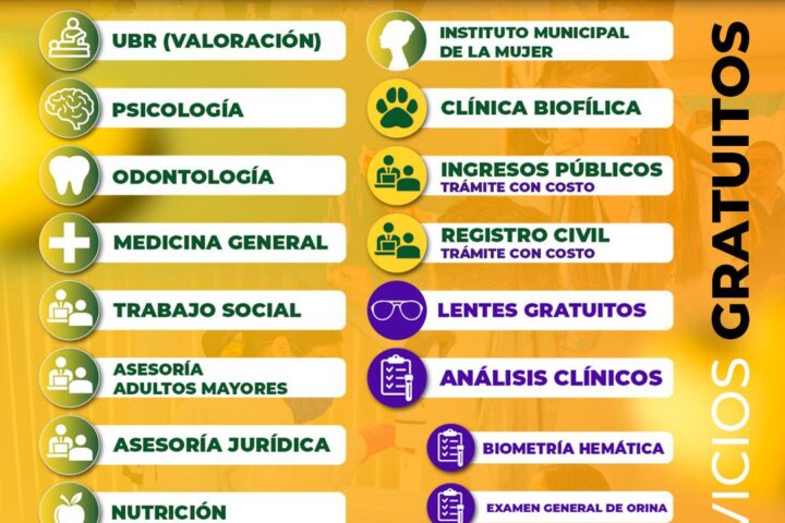 Los servicios gratuitos que se ofrecerán durante esta campaña incluirán medicina general, psicología, odontología, nutrición, trabajo social, asesoría jurídica, asesoría a adultos mayores, valoración en ubr, Instituto municipal de la mujer, clínica biofílica, lentes gratuitos así como análisis clínicos.