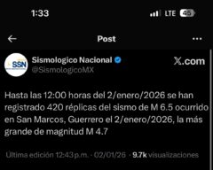 El Servicio Sismológico Nacional informó que hasta las 12:00 horas de este jueves 2 de enero de 2026 se han registrado 420 réplicas del sismo de magnitud 6.5, ocurrido el mismo día con epicentro en San Marcos, Guerrero. De acuerdo con el reporte oficial, la réplica de mayor magnitud alcanzó los 4.7 grados, como parte […]