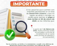 El Gobierno Municipal de Huamantla, a través del área de Desarrollo Urbano, informó a la ciudadanía que los trámites pendientes cuyo recibo de pago no fue recogido y pagado a antes del 30 de enero de 2026, serán actualizados conforme al incremento de la nueva UMA (Unidad de Medida y Actualización). De acuerdo con el […]
