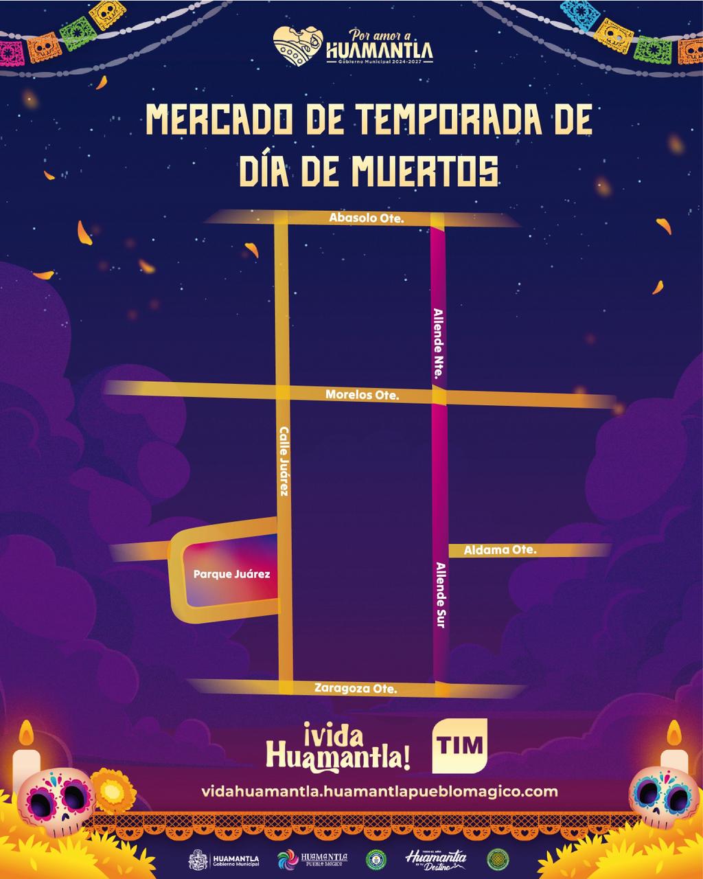 El H. Ayuntamiento de Huamantla informa que, con motivo de la instalación del Tianguis de Temporada de Día de Muertos, la calle Allende Nte. y Sur permanecerá cerrada al flujo vehicular desde Abasolo hasta Zaragoza, manteniendo únicamente el paso peatonal para quienes acudan a realizar sus compras.