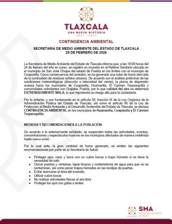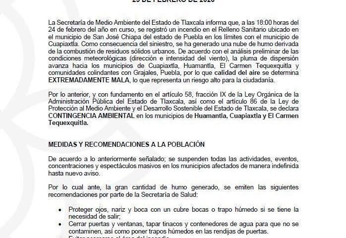 La Secretaría de Medio Ambiente del Estado de Tlaxcala declaró contingencia ambiental en los municipios de Huamantla, Cuapiaxtla y El Carmen Tequexquitla, luego del incendio registrado a las 18:00 horas del 24 de febrero en el Relleno Sanitario ubicado en el municipio de San José Chiapa, Puebla, en los límites con Cuapiaxtla.
