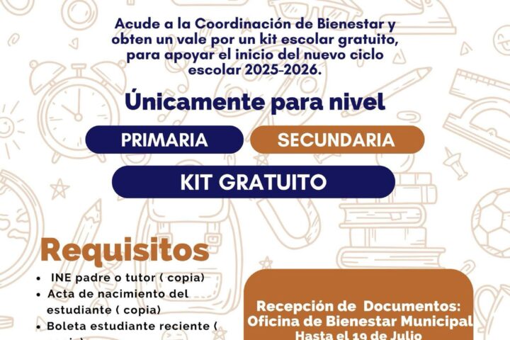 El Gobierno Municipal de Ixtenco, que encabeza la presidenta Aline Lazo Caballero, informa a las madres, padres y tutores del municipio que se amplía el plazo para la recepción de documentos y entrega de vales correspondientes al Kit Escolar 2025-2026. Esta extensión se realizará del 14 al 19 de julio, con el objetivo de que ninguna niña o niño del municipio se quede sin este importante apoyo para el próximo ciclo escolar.