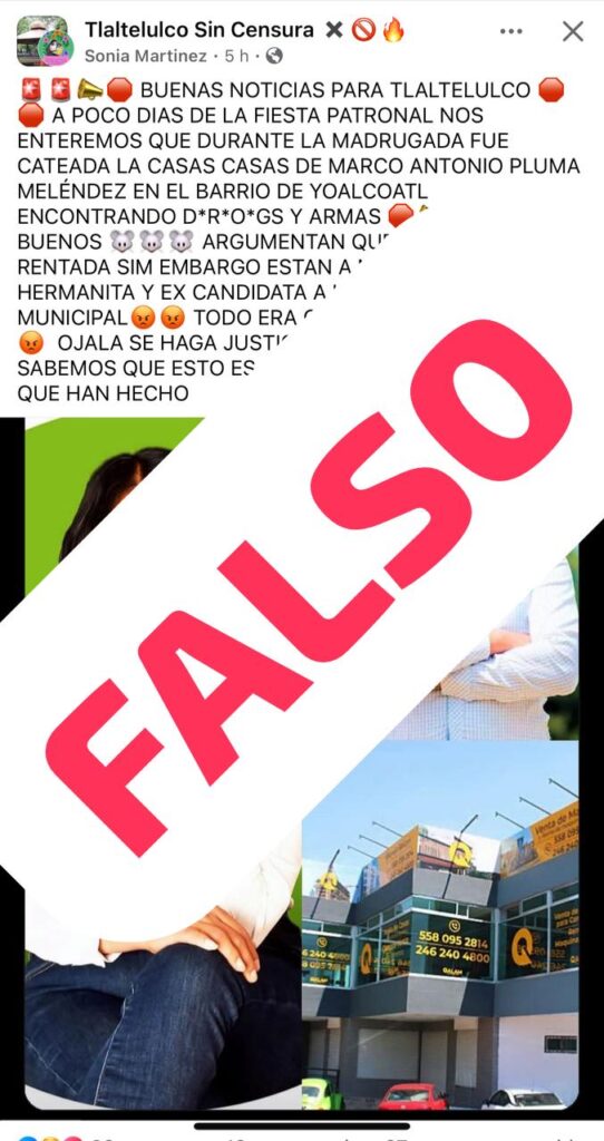 Tras la circulación de una publicación en redes sociales donde se afirma que una propiedad vinculada al ex presidente municipal de Tlatelulco, Marco Antonio Pluma Meléndez, fue cateada y se encontraron drogas y armas, el propio ex edil desmintió categóricamente dicha información.