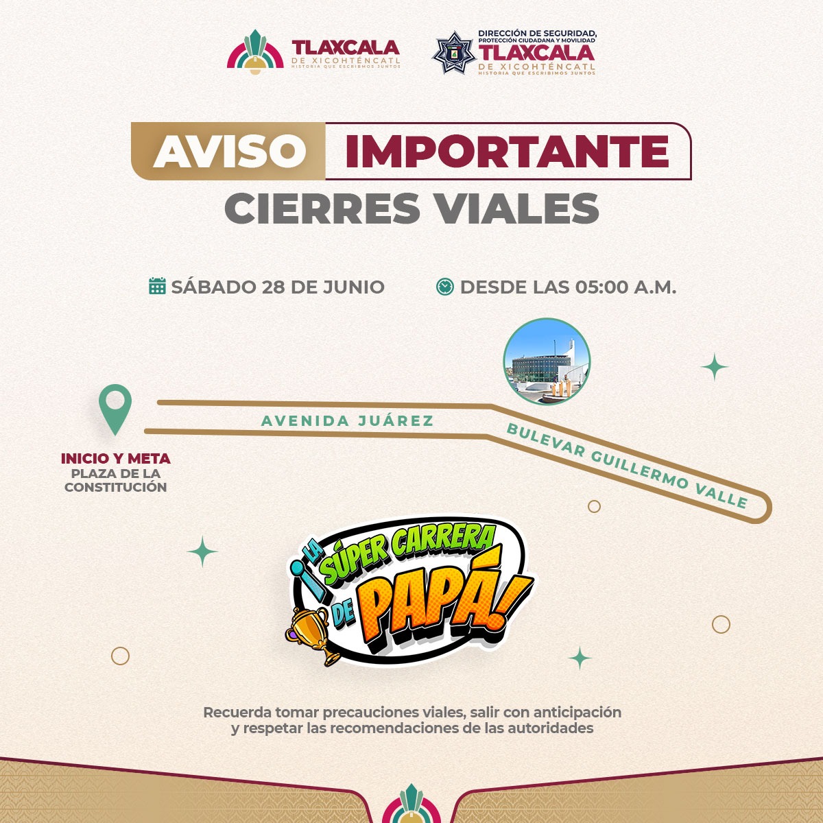 El Gobierno Municipal de Tlaxcala, a través del Sistema Municipal DIF, informa a la ciudadanía que este sábado 28 de junio de 2025, se llevará a cabo «La Súper Carrera del Papá», organizada en coordinación con el Sistema Estatal DIF, en el marco de las actividades alusivas al Día del Padre.