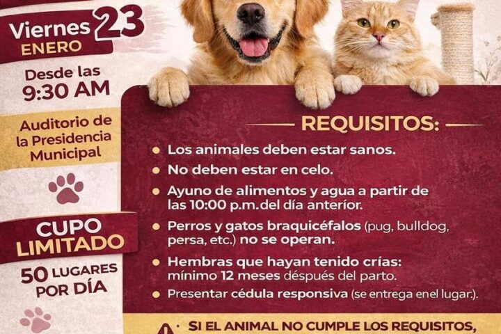 El Gobierno Municipal de Ixtenco, que encabeza Aline Lazo Caballero, informó que los días lunes 19 y viernes 23 de enero se llevará a cabo la Campaña Gratuita de Esterilización Canina y Felina, con el propósito de fomentar la tenencia responsable de mascotas y contribuir al control de la población animal en el municipio.