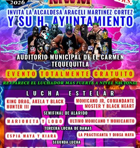 El Gobierno Municipal de El Carmen Tequexquitla invita a toda la ciudadanía a disfrutar de una espectacular función gratuita de lucha libre, organizada como parte de las actividades de inicio de año para promover la convivencia familiar y el sano entretenimiento.