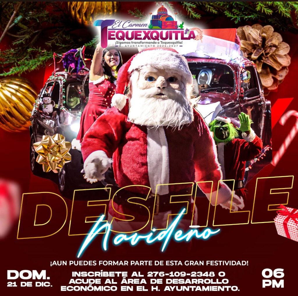 El Gobierno Municipal de El Carmen Tequexquitla, encabezado por la Presidenta Municipal Araceli Martínez Cortés, invita a la ciudadanía a participar en el tradicional Desfile Navideño, una actividad que busca fortalecer la convivencia familiar y preservar las tradiciones decembrinas en el municipio.
