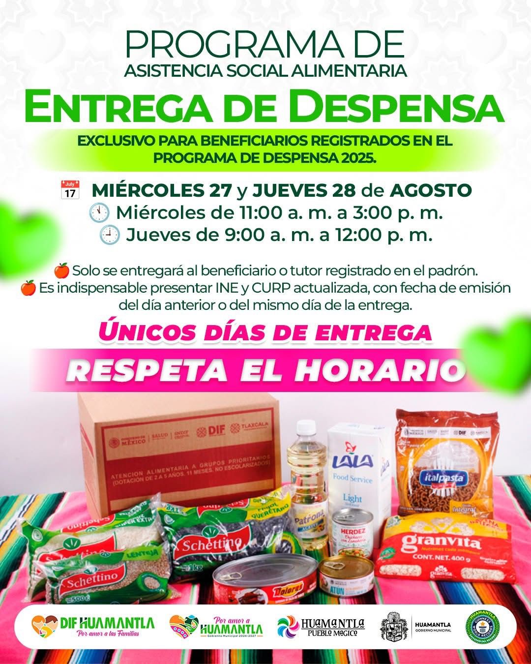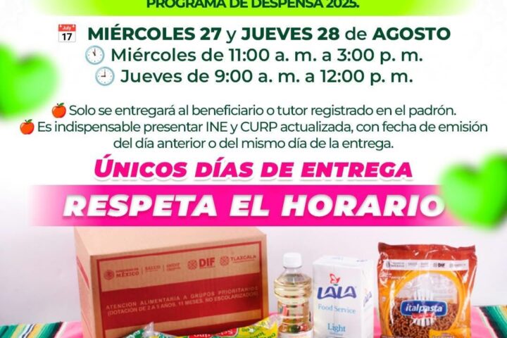 El Sistema Municipal para el Desarrollo Integral de la Familia (SMDIF) Huamantla informa a las y los beneficiarios del Programa de Asistencia Social Alimentaria que la entrega de despensas correspondiente al mes de agosto se realizará los días miércoles 27 de agosto, en un horario de 11:00 a.m. a 3:00 p.m. Y el jueves 28 de agosto de 9:00 a.m. a 12:00 p.m en sus instalaciones ubicadas en calle Fernando Hernández Carrasco 101, Barrio San José.