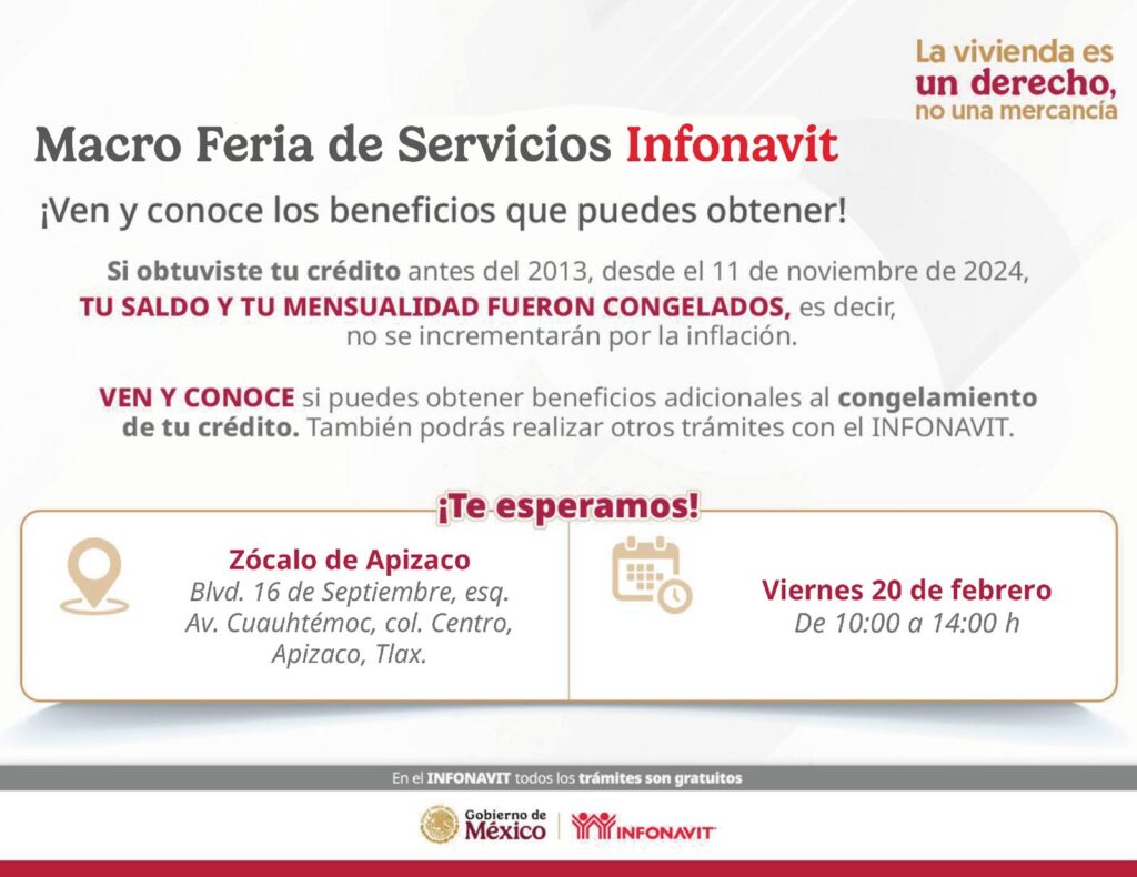 La delegada del Infonavit en Tlaxcala, Alejandra Ramírez Ortiz, dio a conocer a través de sus plataformas digitales la realización de la Feria de Soluciones de Pago en Apizaco, como parte de una estrategia para acercar servicios y asesoría a la población trabajadora.