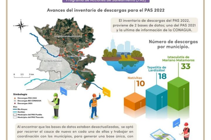 En este sentido y como resultado del trabajo coordinado entre el estado, la Federación y los municipios, se refiere que el inventario de descargas del PAS 2022 asciende a un total de 61 puntos de descarga en las comunas de las cuales 33 corresponden a Ixtacuixtla, 18 a Tepetitla y 10 a Natívitas, por lo que en coordinación con los alcaldes se realizan los trabajos de saneamiento correspondientes a fin de evitar esta problemática.