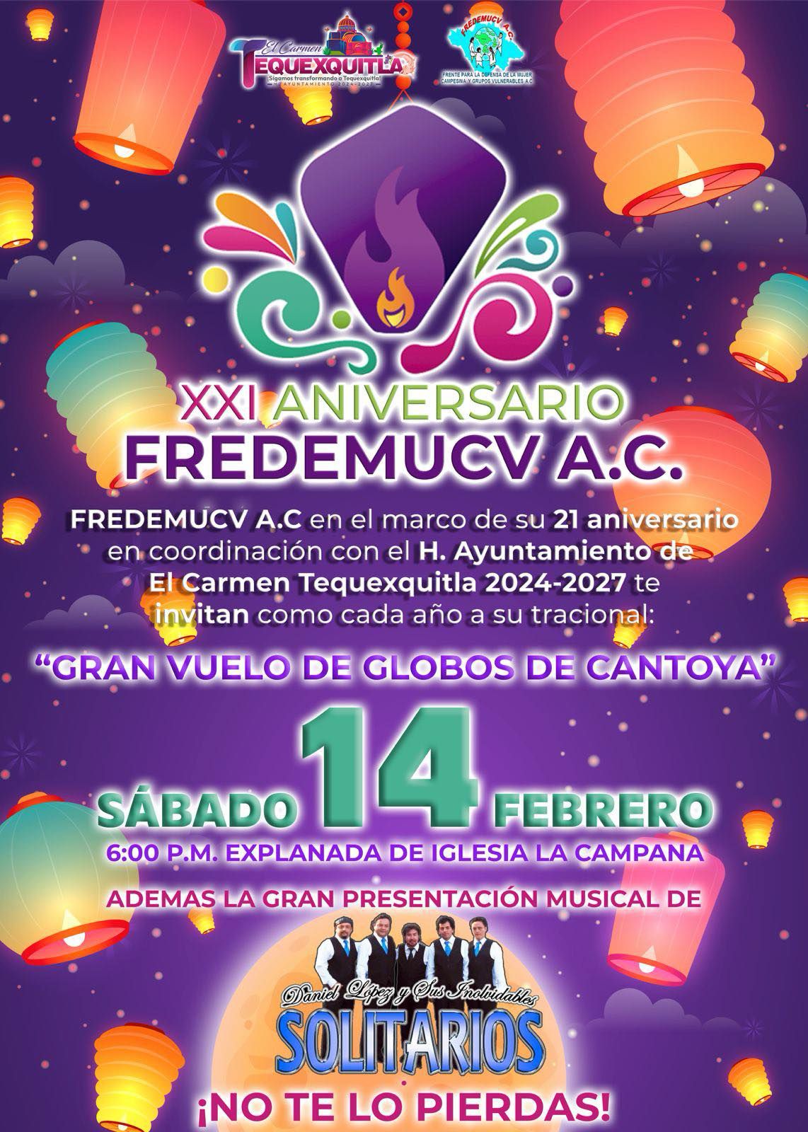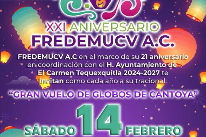 En el marco del XXI aniversario de FREDEMUCV A.C., se realizará el tradicional “Gran Vuelo de Globos de Cantoya”, en coordinación con el Gobierno Municipal de El Carmen Tequexquitla, como parte de las actividades conmemorativas de esta organización.