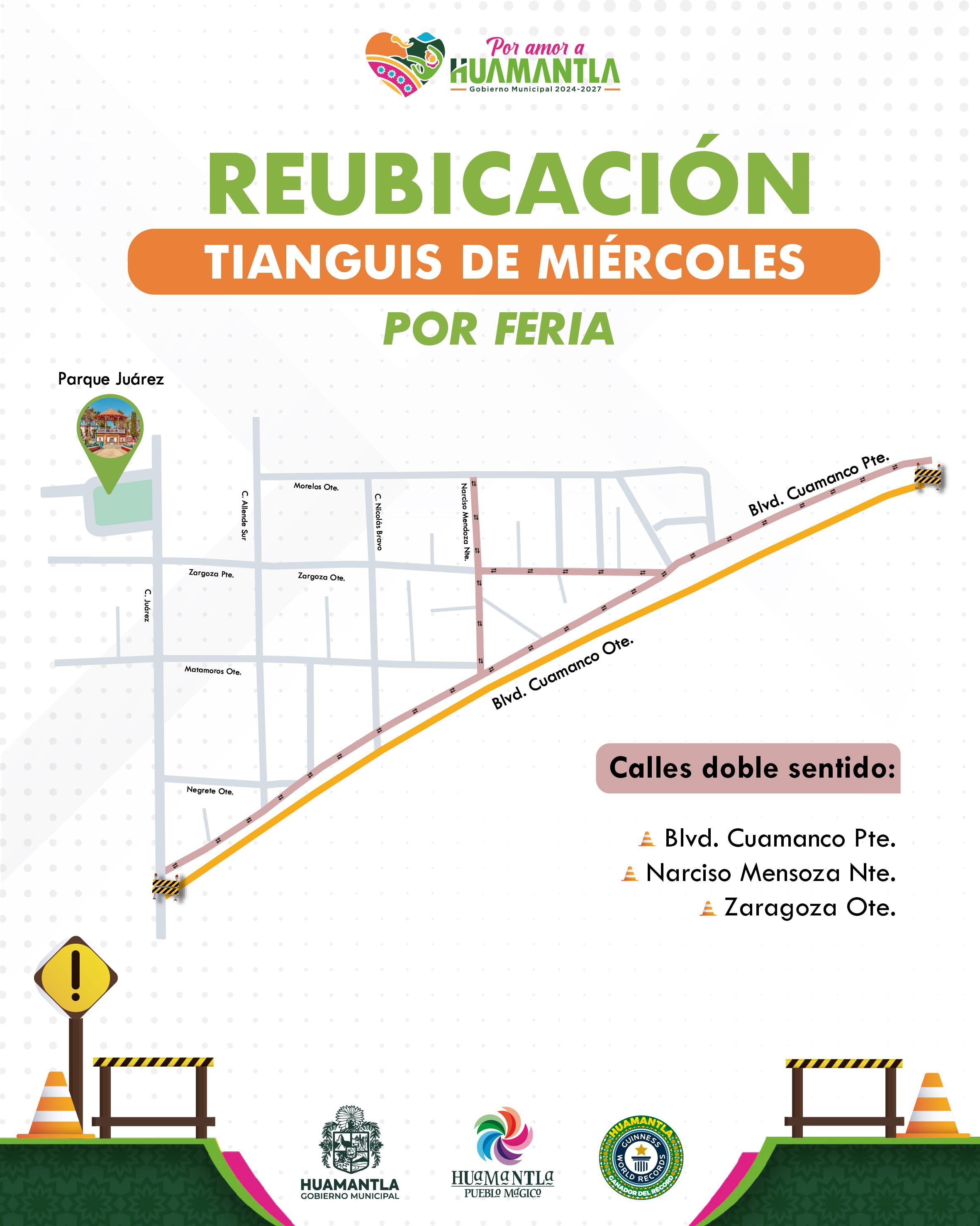 El Gobierno Municipal de Huamantla que preside Salvador Santos Cedillo informa a la ciudadanía y a los comerciantes que, con motivo de los preparativos para la Feria Internacional del Arte Efímero y la Dalia 2025, el tianguis de los miércoles será reubicado temporalmente al Bulevar Cuamanco desde calle Juárez hasta calle Soltepec a partir del miércoles 16 de julio hasta el 10 de septiembre.