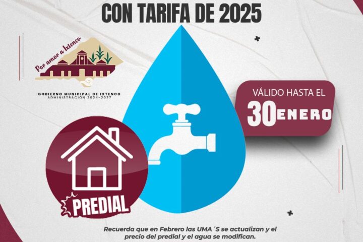 El Gobierno Municipal de Ixtenco, que encabeza la presidenta municipal Aline Lazo Caballero, informa a la ciudadanía que hasta el próximo 30 de enero se podrán realizar los pagos del servicio de agua potable y del impuesto predial 2026 con tarifas calculadas conforme a la UMA 2025.