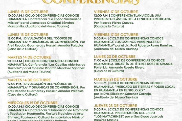 Durante estas jornadas, se presentarán diversas ponencias a cargo de historiadores, investigadores y personalidades locales y estatales, quienes compartirán temas que resaltan el legado, las tradiciones y los retos actuales de Huamantla.
