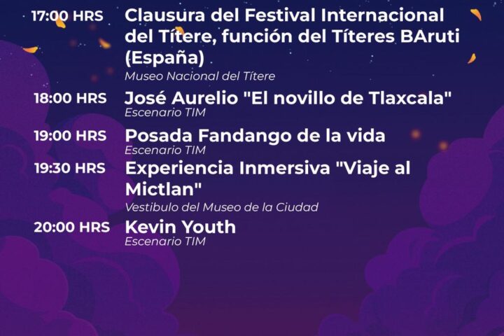Las actividades comenzarán a las 17:00 horas con la clausura del Festival Internacional del Títere en el Museo Nacional del Títere donde se presentará la función de títeres Baruti, compañía proveniente de España.