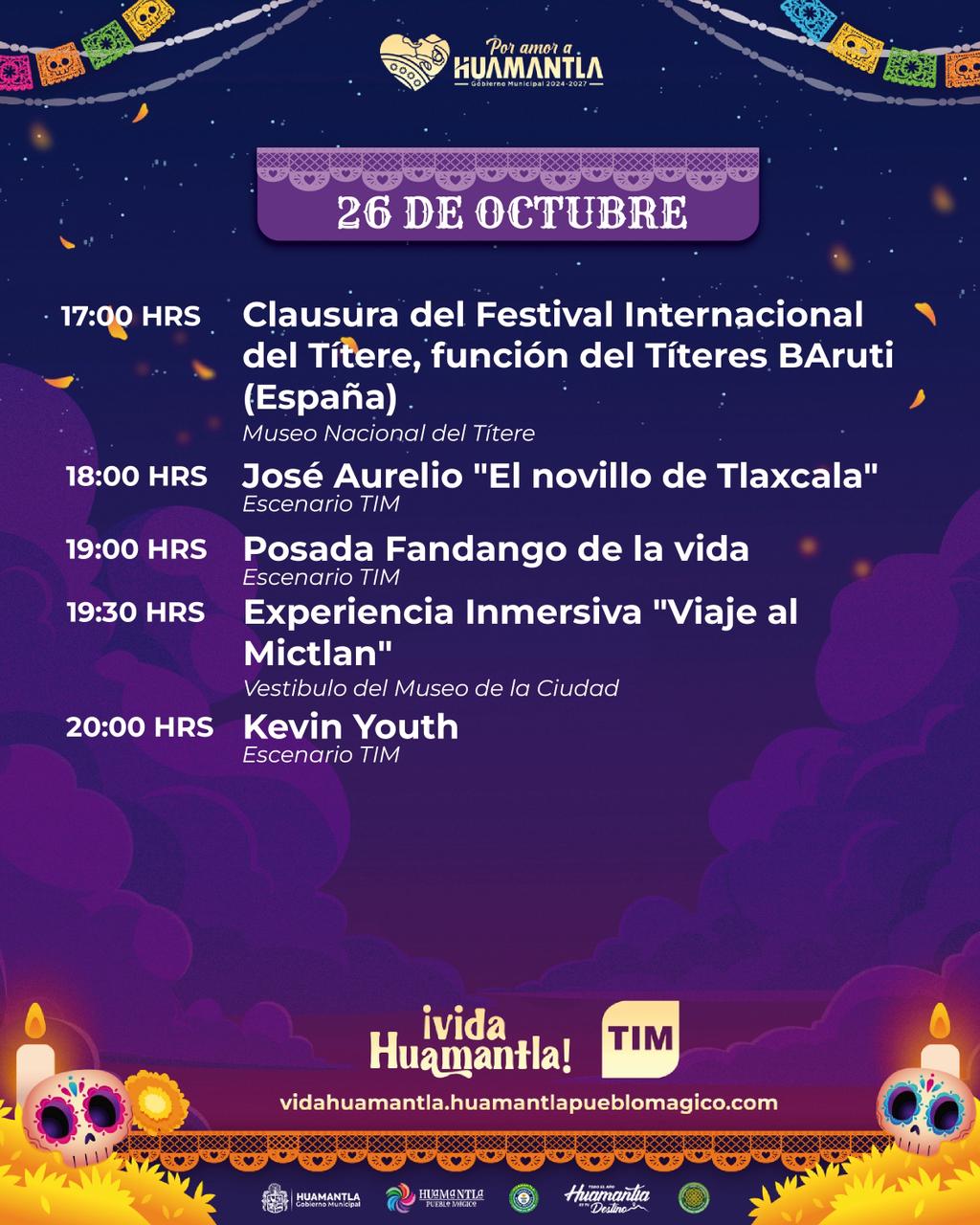 El Ayuntamiento de Huamantla invita a la ciudadanía y visitantes a disfrutar de las actividades culturales que se llevarán a cabo este domingo 26 de octubre como parte del Festival Vida Huamantla, un proyecto que celebra nuestras tradiciones, el arte y la memoria colectiva en el marco del Día de Muertos.