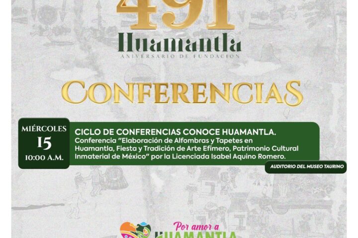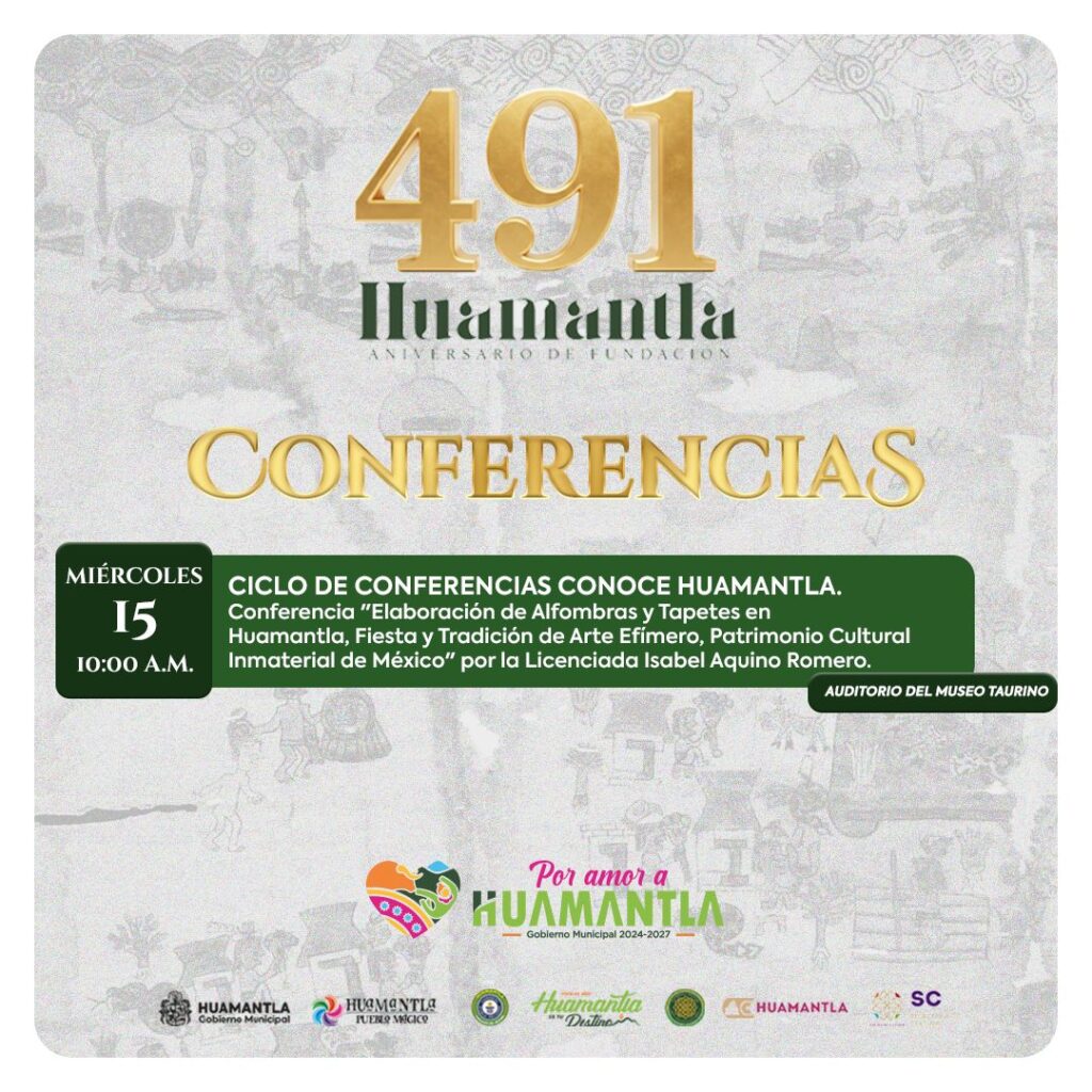 Este miércoles 15 de octubre, a las 10:00 horas, en el Auditorio del Museo Taurino, se llevará a cabo la conferencia “Elaboración de alfombras y tapetes en Huamantla, fiesta y tradición de Arte Efímero, Patrimonio Cultural Inmaterial de México”, impartida por la Lic. Isabel Aquino Romero, cronista municipal. Durante la charla, se abordará el proceso, significado y trascendencia de esta manifestación artística reconocida a nivel nacional e internacional como un símbolo del pueblo huamantleco.