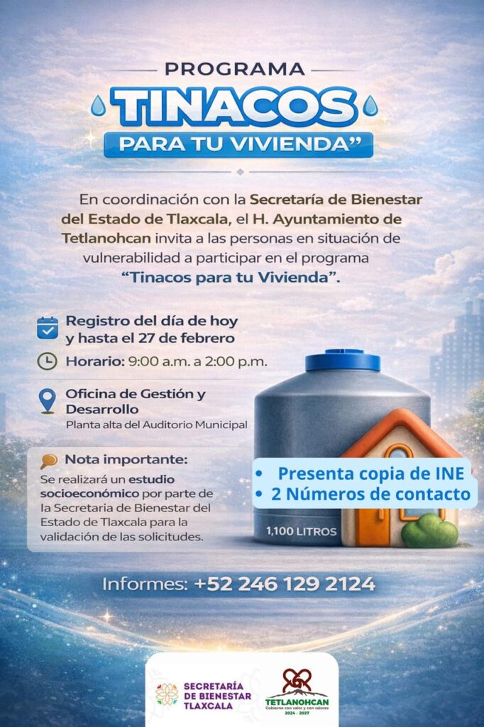 El Gobierno Municipal de Tetlanohcan, encabezado por Kritsbey Pérez Flores, en coordinación con la Secretaría de Bienestar del Estado de Tlaxcala, mantiene abierto el registro al programa “Tinacos para tu Vivienda”, dirigido a personas de bajos recursos y en situación de vulnerabilidad del municipio.