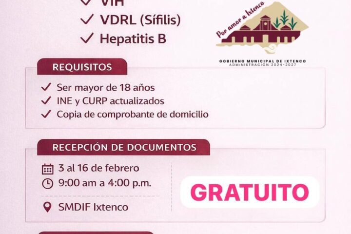 La recepción de documentos se llevará a cabo del 3 al 16 de febrero, en un horario de 9:00 de la mañana a 4:00 de la tarde en las instalaciones del SMDIF, mientras que la toma de muestras está programada para los días 20 y 21 de febrero.