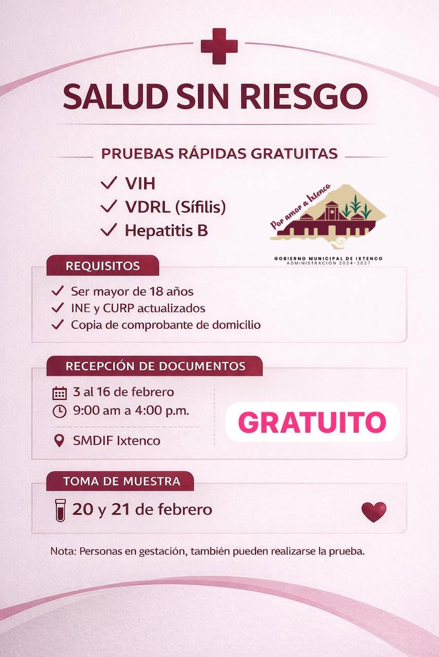 Con el objetivo de fortalecer la prevención y el cuidado de la salud en el municipio, el Sistema Municipal DIF Ixtenco, en coordinación con el Gobierno Municipal, puso en marcha la campaña “Salud Sin Riesgo”, enfocada en la detección oportuna de enfermedades de transmisión sexual mediante pruebas rápidas.