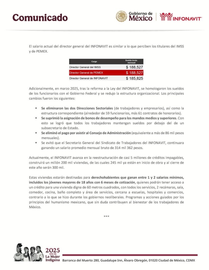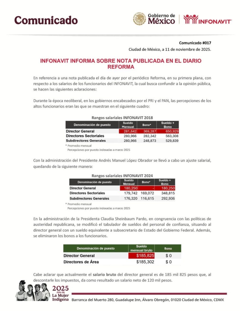 En referencia a una nota publicada el día de ayer por el periódico Reforma, en su primera plana, con respecto a los salarios de los funcionarios del INFONAVIT, la cual busca confundir a la opinión pública, se hacen las siguientes aclaraciones: