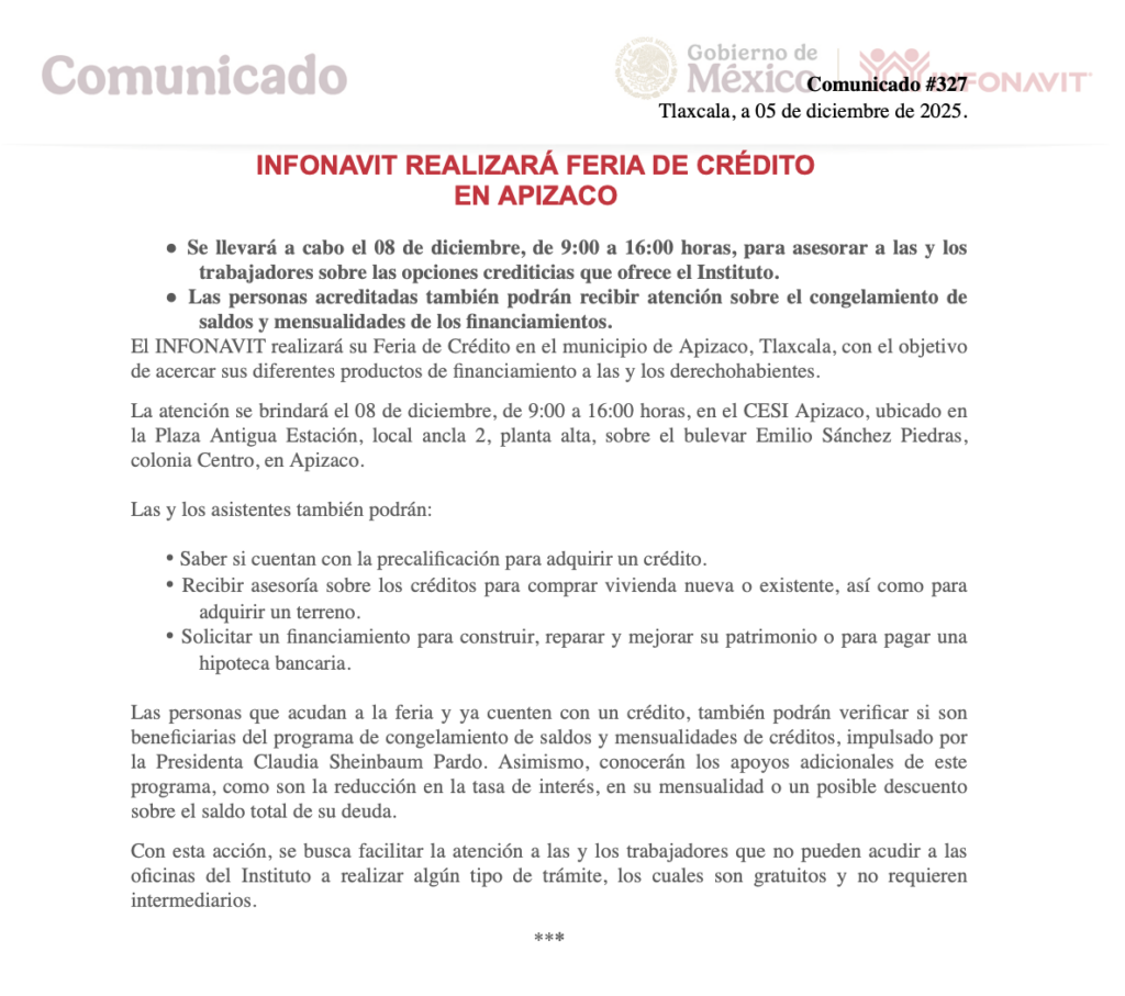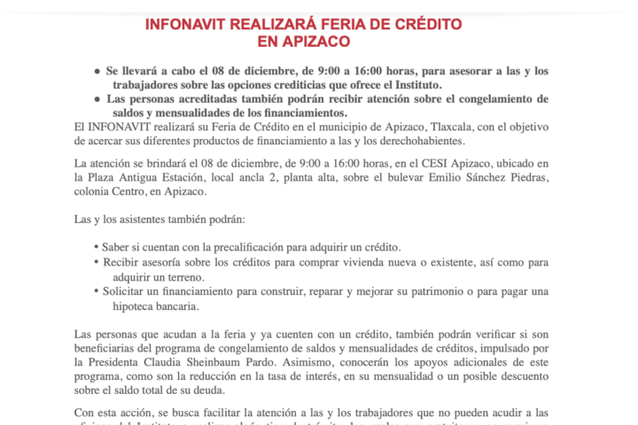 El INFONAVIT realizará su Feria de Crédito en el municipio de Apizaco, Tlaxcala, con el objetivo de acercar sus diferentes productos de financiamiento a las y los derechohabientes.