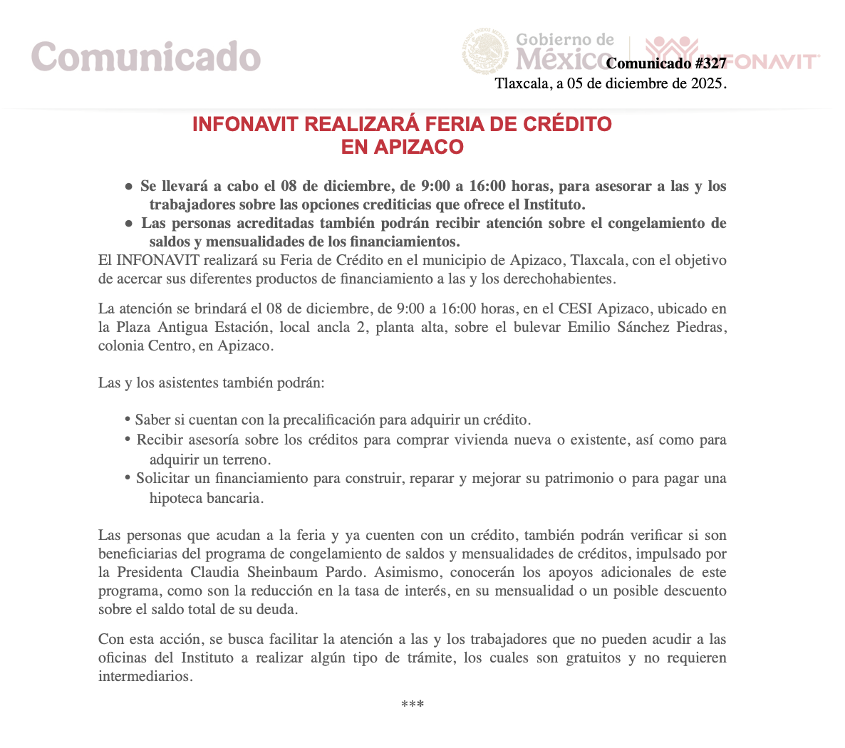 La atención se brindará el 08 de diciembre, de 9:00 a 16:00 horas, en el CESI Apizaco, ubicado en la Plaza Antigua Estación, local ancla 2, planta alta, sobre el bulevar Emilio Sánchez Piedras, colonia Centro, en Apizaco.