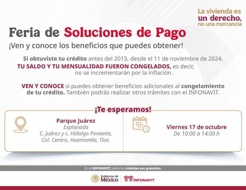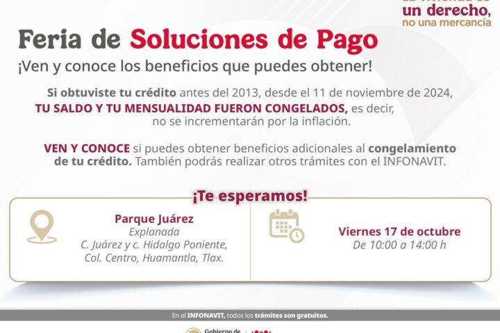 El Infonavit Tlaxcala, llevará a cabo la Feria de Soluciones de Pago este viernes 17 de octubre, en beneficio de las y los derechohabientes de la zona oriente de la entidad.