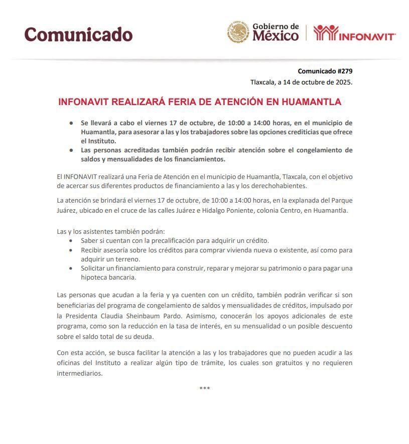 La jornada se desarrollará de 10:00 a 14:00 horas en el Parque Juárez, ubicado en avenida Juárez y calle Hidalgo poniente en Huamantla, donde asesores especializados del Infonavit brindarán atención personalizada para reestructurar financiamientos, acceder a prórrogas sin intereses, resolver dudas sobre saldos congelados y explorar mecanismos de alivio económico que fortalezcan la estabilidad financiera y protejan el patrimonio familiar.