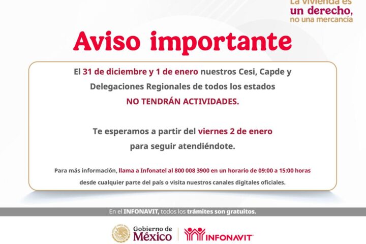 De acuerdo con el aviso, el Instituto del Fondo Nacional de la Vivienda para los Trabajadores no tendrá actividades los días 31 de diciembre y 1 de enero en sus Centros de Servicio Infonavit (CESI), Centros de Atención a Pensionados y Devoluciones (CAPDE), así como en las Delegaciones Regionales de todo el país .