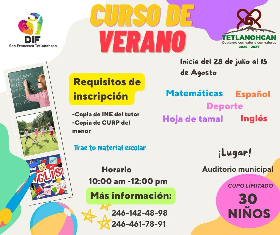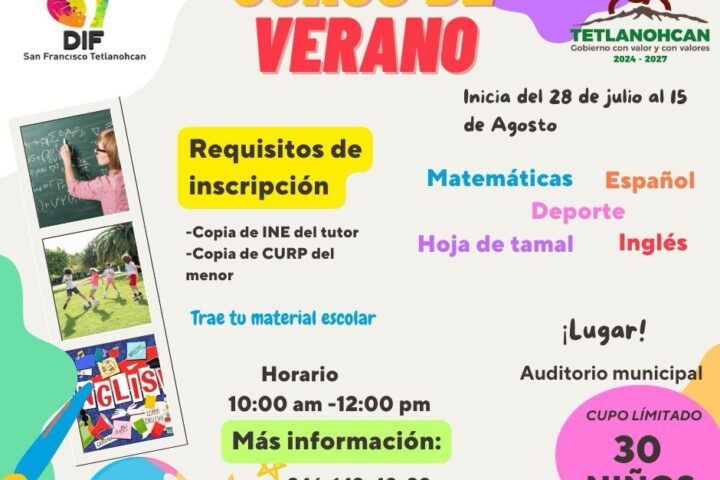 La directora del DIF Tetlanohcan, Mónica Coyomatzi, detalló que el curso se llevará a cabo del 28 de julio al 15 de agosto en el Auditorio Municipal, en un horario de 10:00 am a 12:00 pm, con un cupo limitado a 30 participantes.