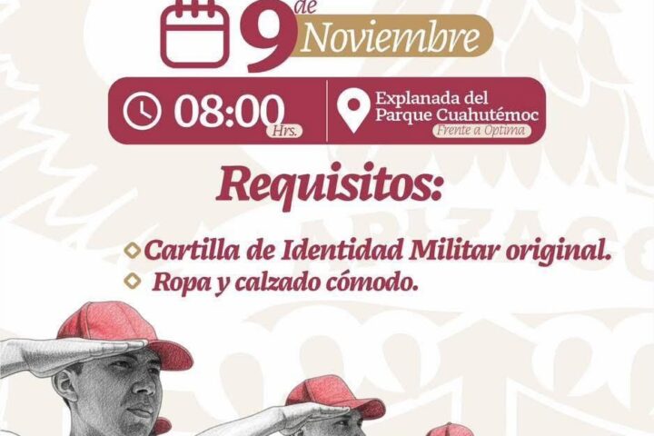 El Gobierno Municipal de Apizaco, en coordinación con la Secretaría de la Defensa Nacional (Defensa) a través de la 23/a Zona Militar, convoca a los jóvenes que tramitaron su cartilla de identidad militar durante el presente año, clase 2007 y remisos, a participar en el sorteo del Servicio Militar Nacional, que se realizará el domingo 9 de noviembre de 2025, a las 08:00 horas, en la explanada del parque Cuauhtémoc.