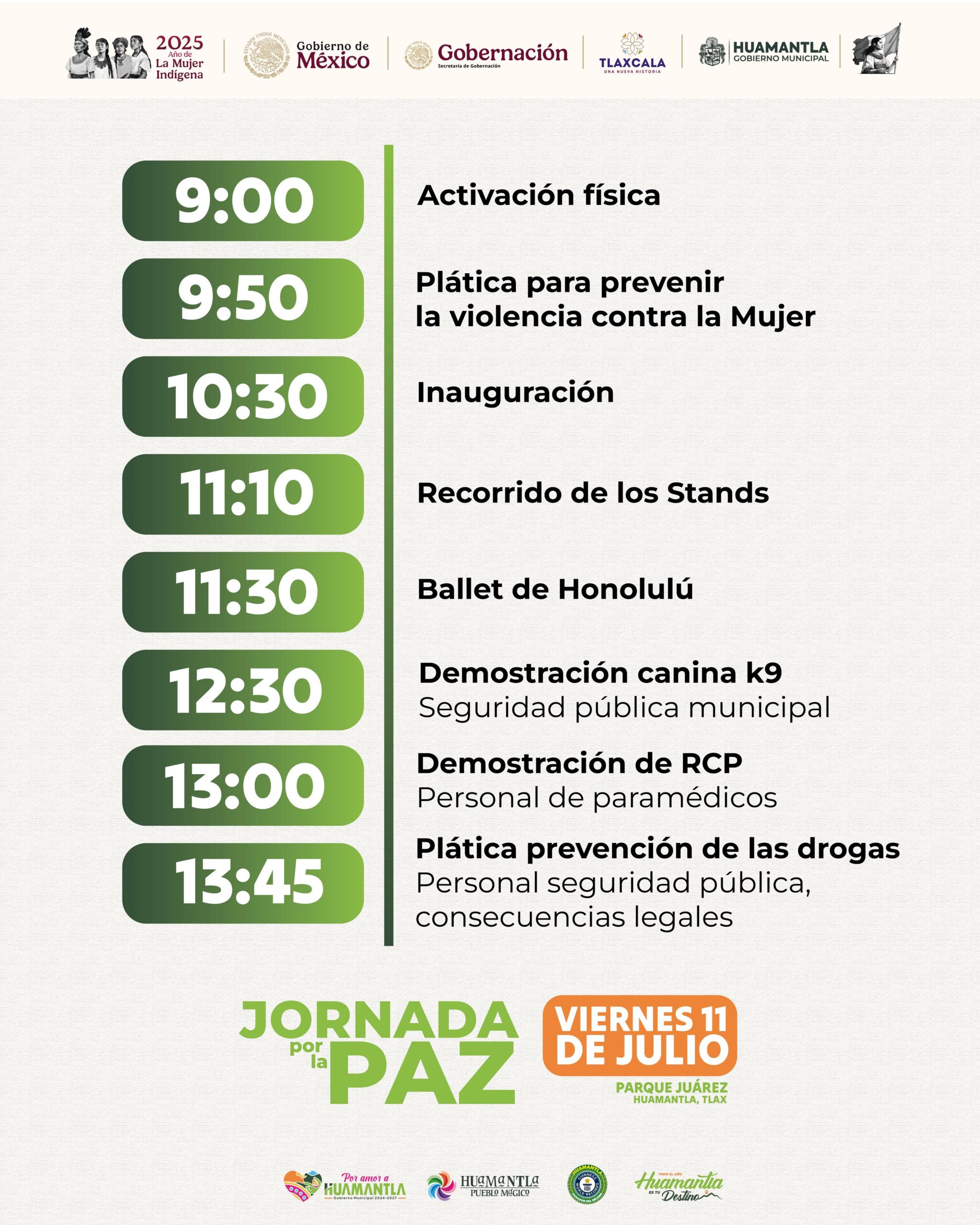 Con la finalidad de fortalecer la cohesión social y promover una cultura de paz entre la ciudadanía, el Gobierno Municipal de Huamantla en coordinación con el Gobierno Federal y del Estado llevarán a cabo la “Jornada por la Paz” este viernes 11 de julio en el Parque Juárez a partir de las 9:00 horas.