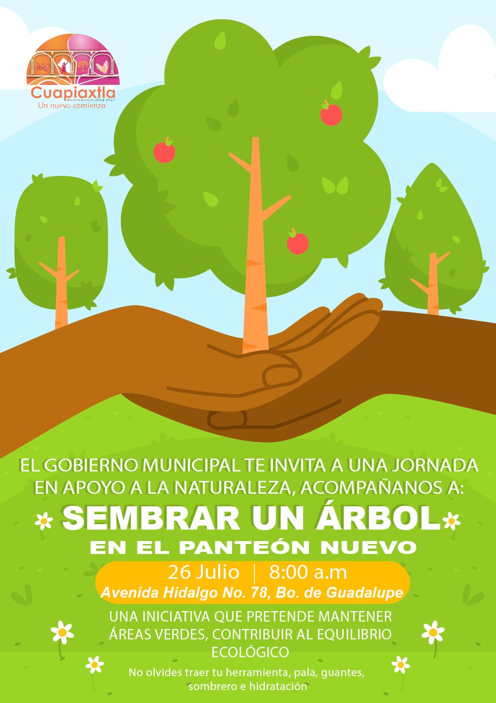 La presidenta municipal, Alma Lorena Escobar González, extiende una cordial invitación a toda la ciudadanía para participar en la jornada “Siembra un Árbol”, que se realizará el próximo sábado 26 de julio, a partir de las 8:00 a.m., en Avenida Hidalgo No. 78, Barrio de Guadalupe, junto al Panteón Nuevo.