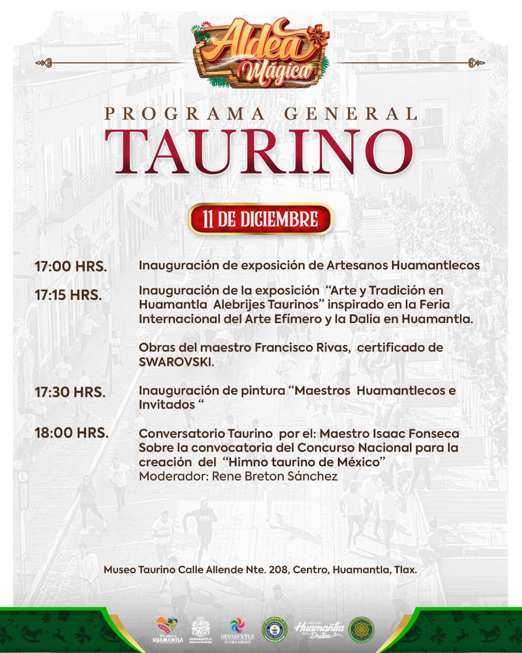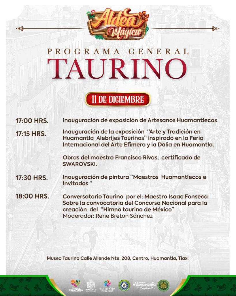 El H. Ayuntamiento de Huamantla invita a toda la ciudadanía a participar en las actividades culturales y taurinas programadas para este jueves 11 de diciembre, dentro del marco de Aldea Mágica, un espacio que destaca el talento local, la tradición y la identidad huamantleca.