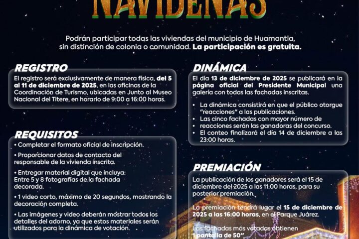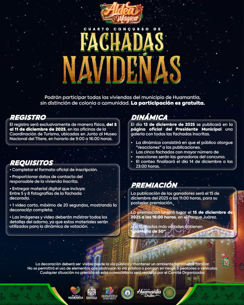 Huamantla, Tlaxcala; [Fecha].– Con la finalidad de promover la convivencia familiar, el espíritu navideño y el orgullo por las tradiciones del municipio, el H. Ayuntamiento de Huamantla lanzó la convocatoria para participar en el 4.º Concurso “Fachadas Mágicas”, abierto a todas las viviendas del municipio sin importar colonia o comunidad. La participación es completamente gratuita.