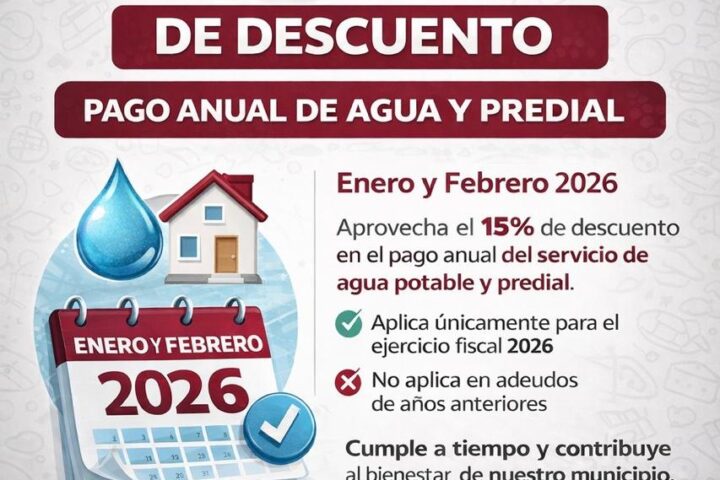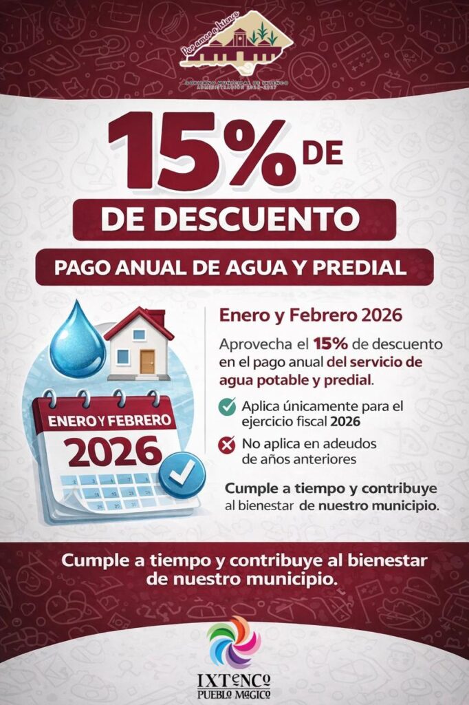 El Gobierno Municipal de Ixtenco informa a la ciudadanía que durante los meses de enero y febrero de 2026 se encuentra vigente un 15% de descuento en el pago anual de los servicios de agua potable y predial, correspondiente al ejercicio fiscal 2026.