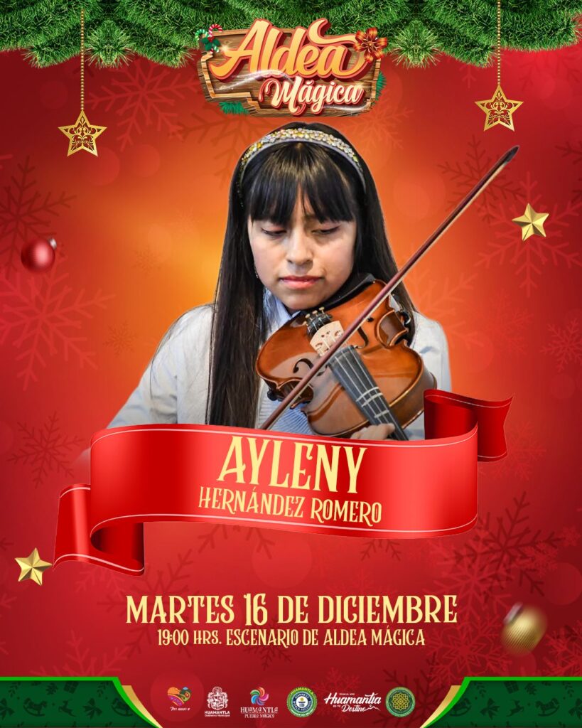 Como parte de las actividades decembrinas que llenan de vida y tradición a la Aldea Mágica, esta noche se llevará a cabo la presentación de Ayleny Hernández Romero, talentosa violinista, en el escenario principal.