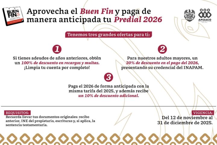 El Gobierno Municipal de Apizaco que preside Javier Rivera Bonilla, a través del Área de Predial, invita a la ciudadanía a aprovechar la Campaña de Pago Anticipado del Predial 2026, que se suma a las promociones de El Buen Fin, ofreciendo importantes descuentos y beneficios para las y los contribuyentes.