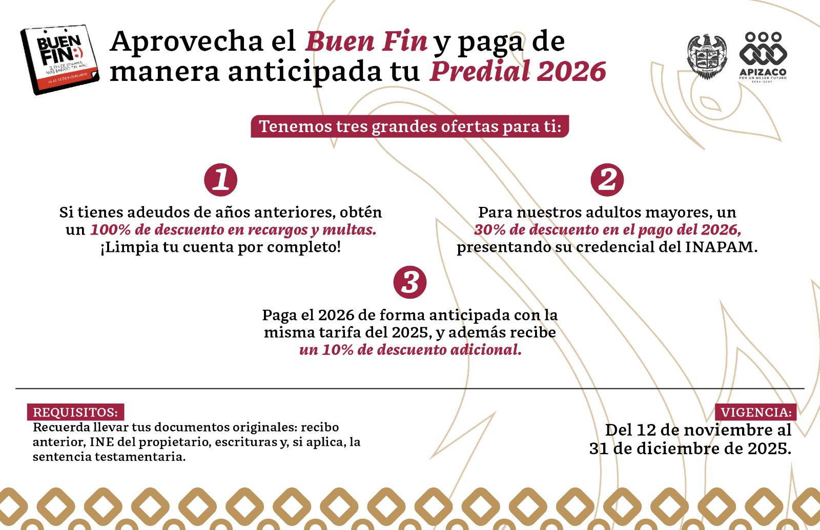 Lanza Ayuntamiento de Apizaco campaña de pago anticipado del predial 2026 con grandes descuentos por El Buen Fin
