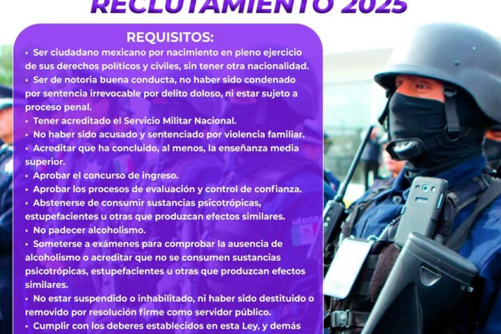 Las y los aspirantes deberán tener entre 18 y 61 años de edad, no portar tatuajes ni perforaciones en el rostro y contar con una estatura mínima de 1.50 m en hombres y 1.43 m en mujeres.