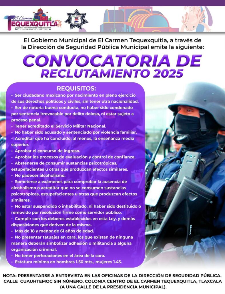 El Gobierno Municipal de El Carmen Tequexquitla, en coordinación con la Dirección de Seguridad Pública Municipal, lanzó la convocatoria oficial de reclutamiento 2025 dirigida a mujeres y hombres interesados en integrarse al cuerpo de seguridad pública del municipio.